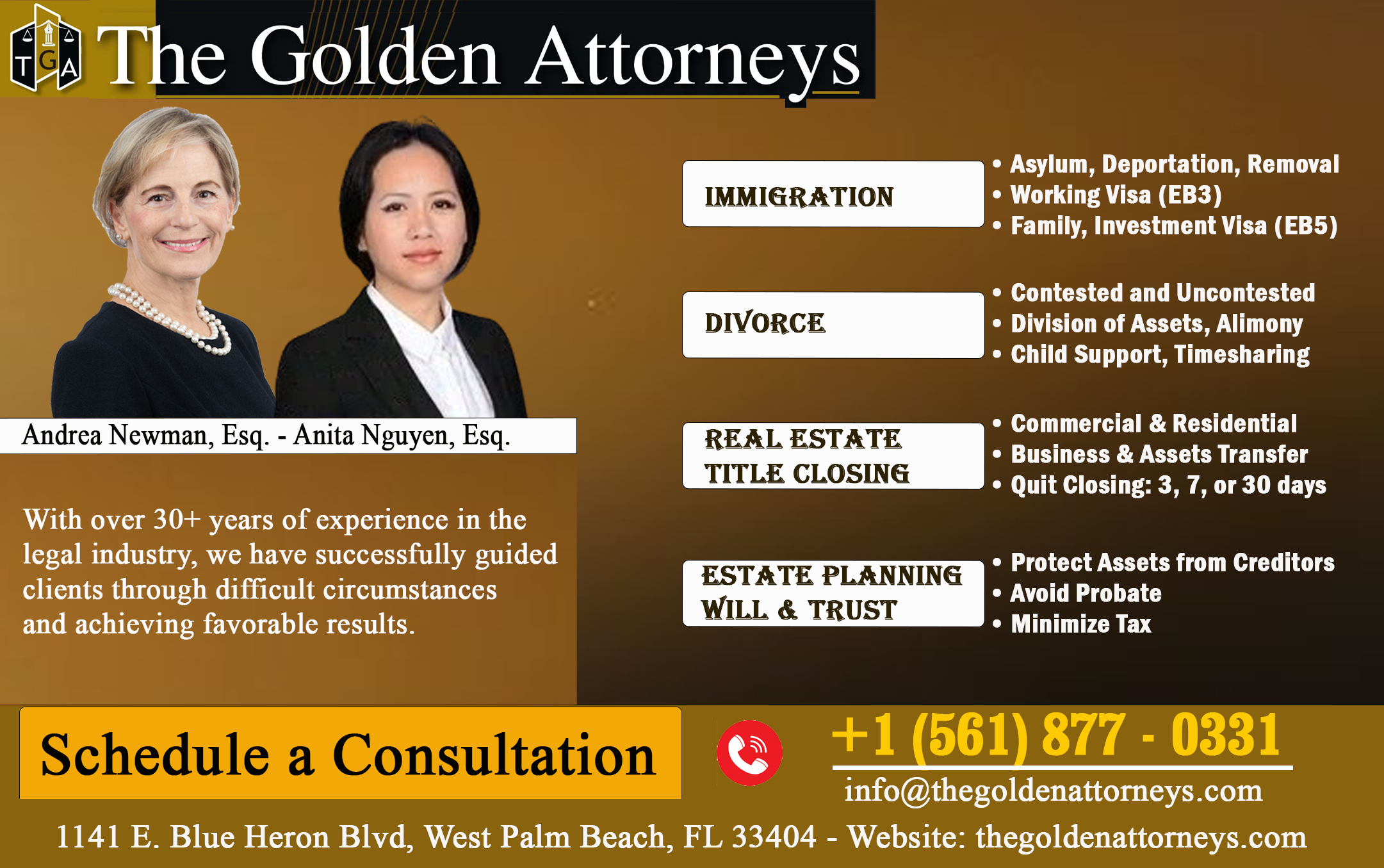 The Golden Attorneys is a local law firm in West Palm Beach, Florida. The law firm located in a beautiful Singer Island Beach. The law firm specializes in Estate Planning, Will, Trust, Real Estate, Title Closing, Immigration, Business and Contract Law. If you have any legal questions, please call or text us at (561) 877-0331 for an appointment.